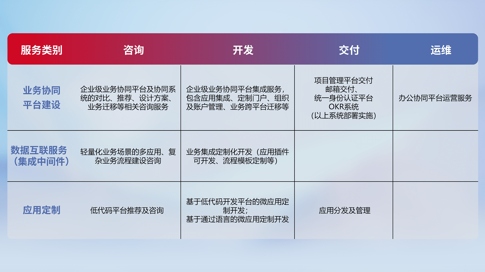 针对钉钉、、企微、、、IDaas等平台级产品提供产品的规划、、、方案、、、、交付、、定制化开发等服务,,实现如统一协同办公、、、、智能客户服务、、、、混合会议管理、、智能数据查询、、、等业务场景,,实现数字化转型。。